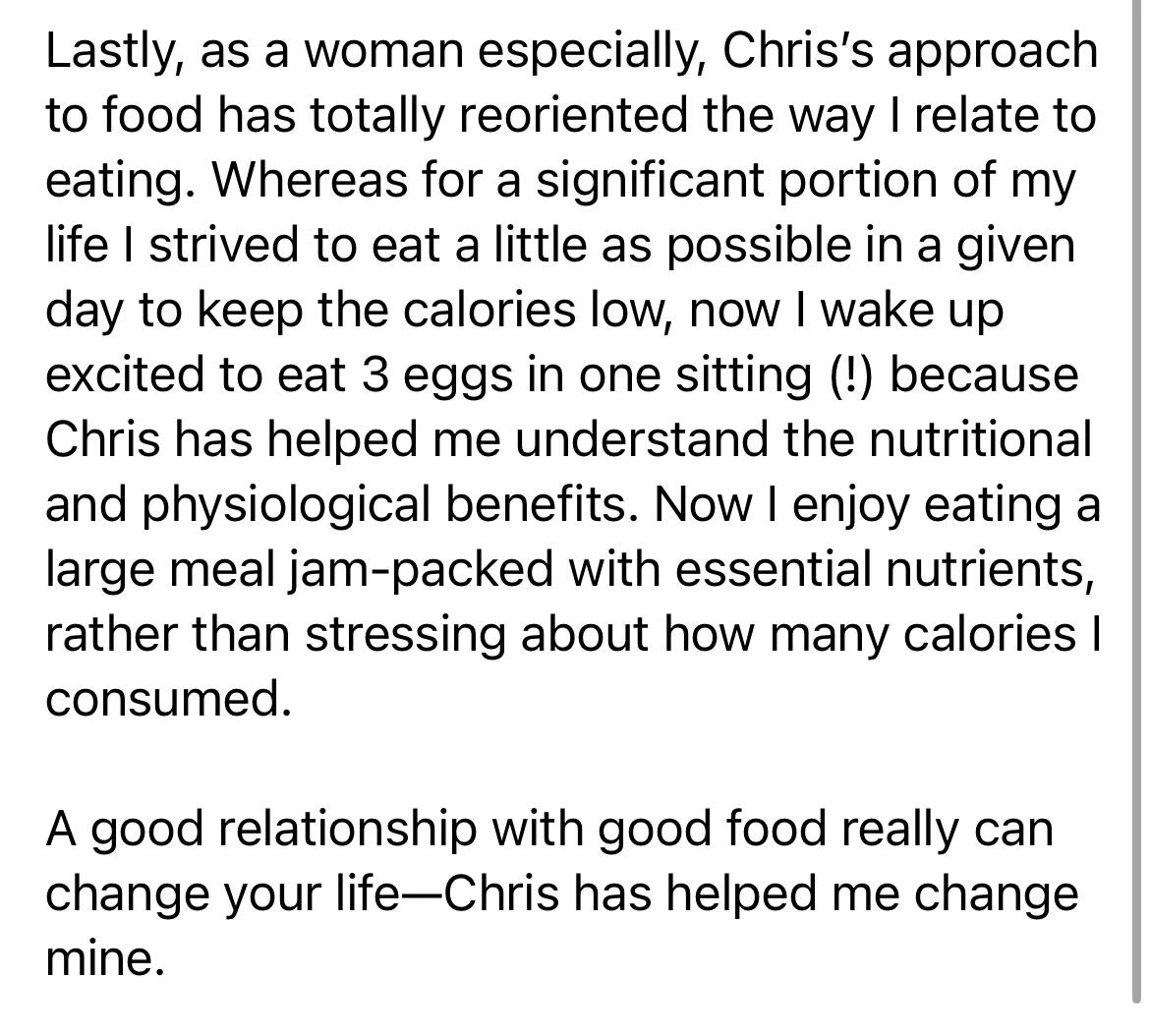Once our clients realize that healthy eating doesn't mean bland food all the time... they start to enjoy food again! I'll help you redefine your relationship with food and guide you to eating food you actually like!